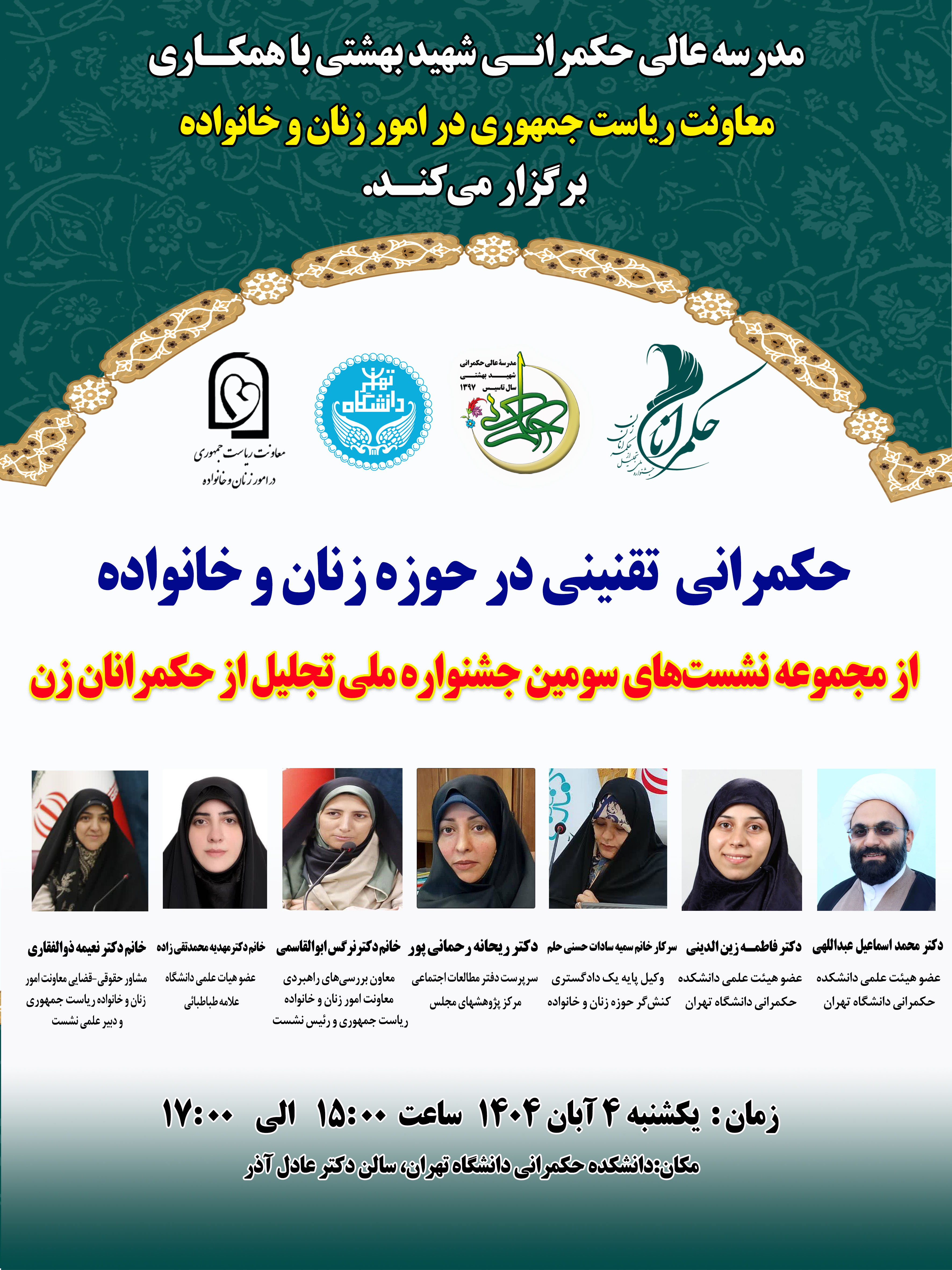 به گزارش روابط عمومی مدرسه عالی حکمرانی شهید بهشتی، یازدهمین نشست از سومین جشنواره ملی تجلیل از حکمرانان زن با موضوع «حکمرانی تقنینی در حوزه زنان و خانواده» روز یکشنبه، چهارم آبان ماه، با همکاری معاونت زنان و خانواده نهاد ریاست جمهوری و دانشکده حکمرانی دانشگاه تهران برگزار شد.