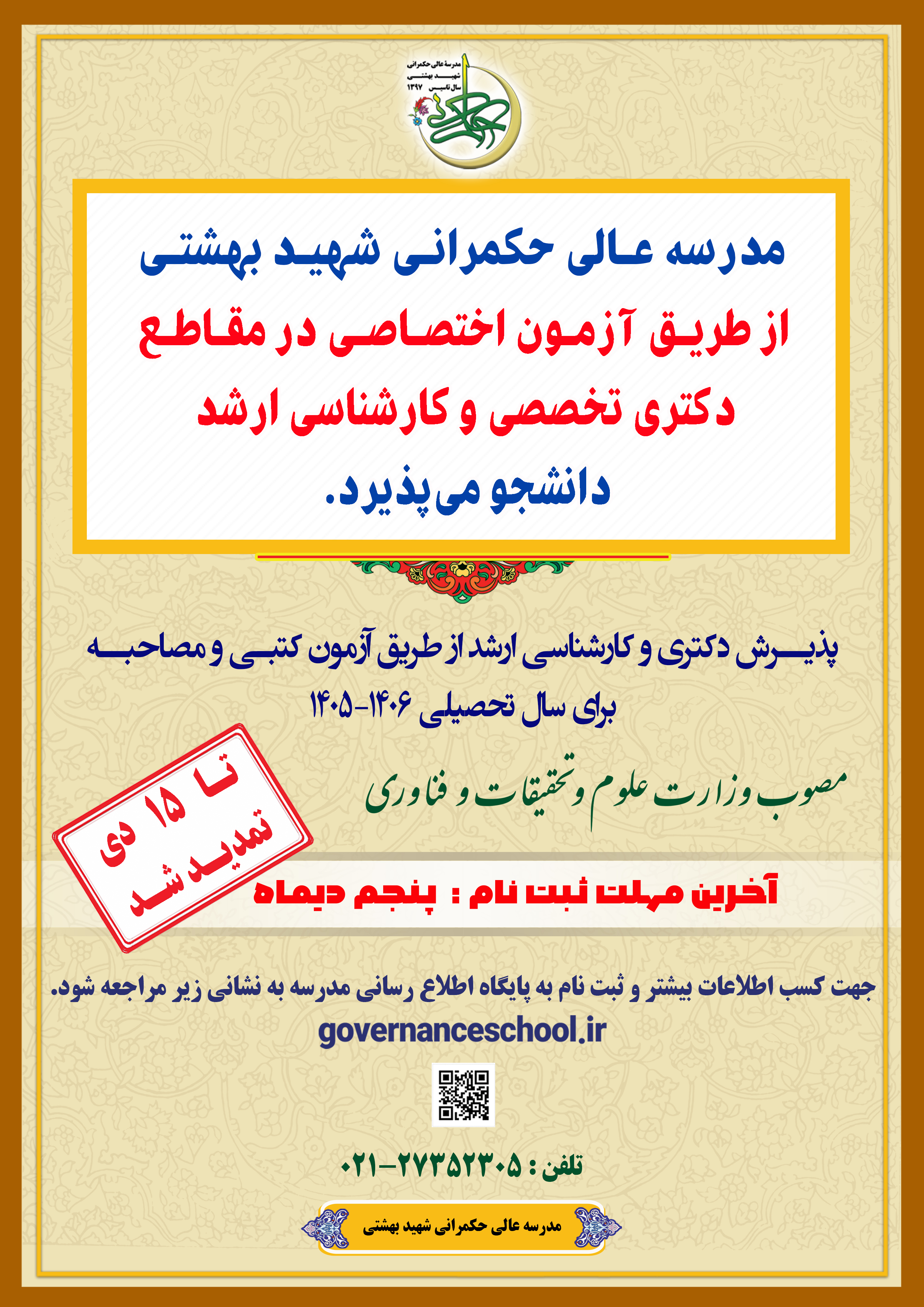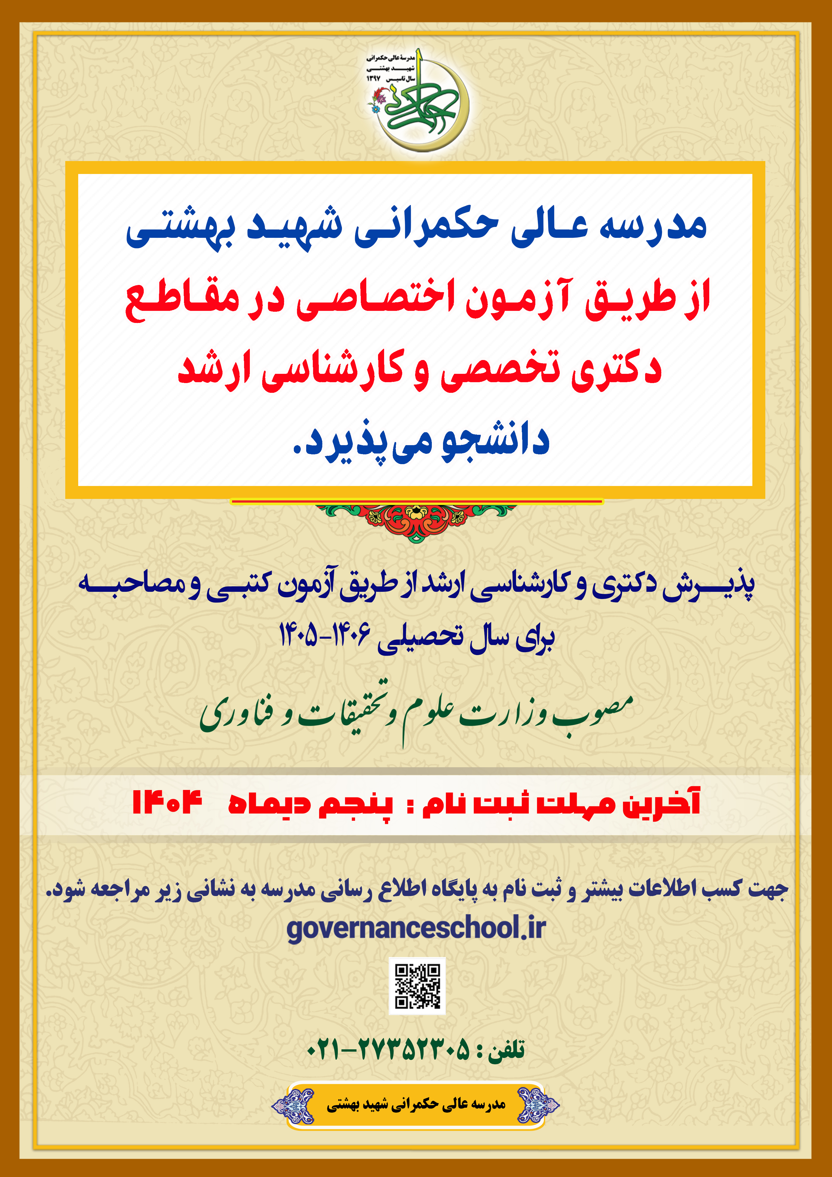 مدرسه عالی حکمرانی شهید بهشتی برای سال تحصیلی 1406-1405در مقاطع دکتری تخصصی و کارشناسی ارشد دانشجو میپذیرد.