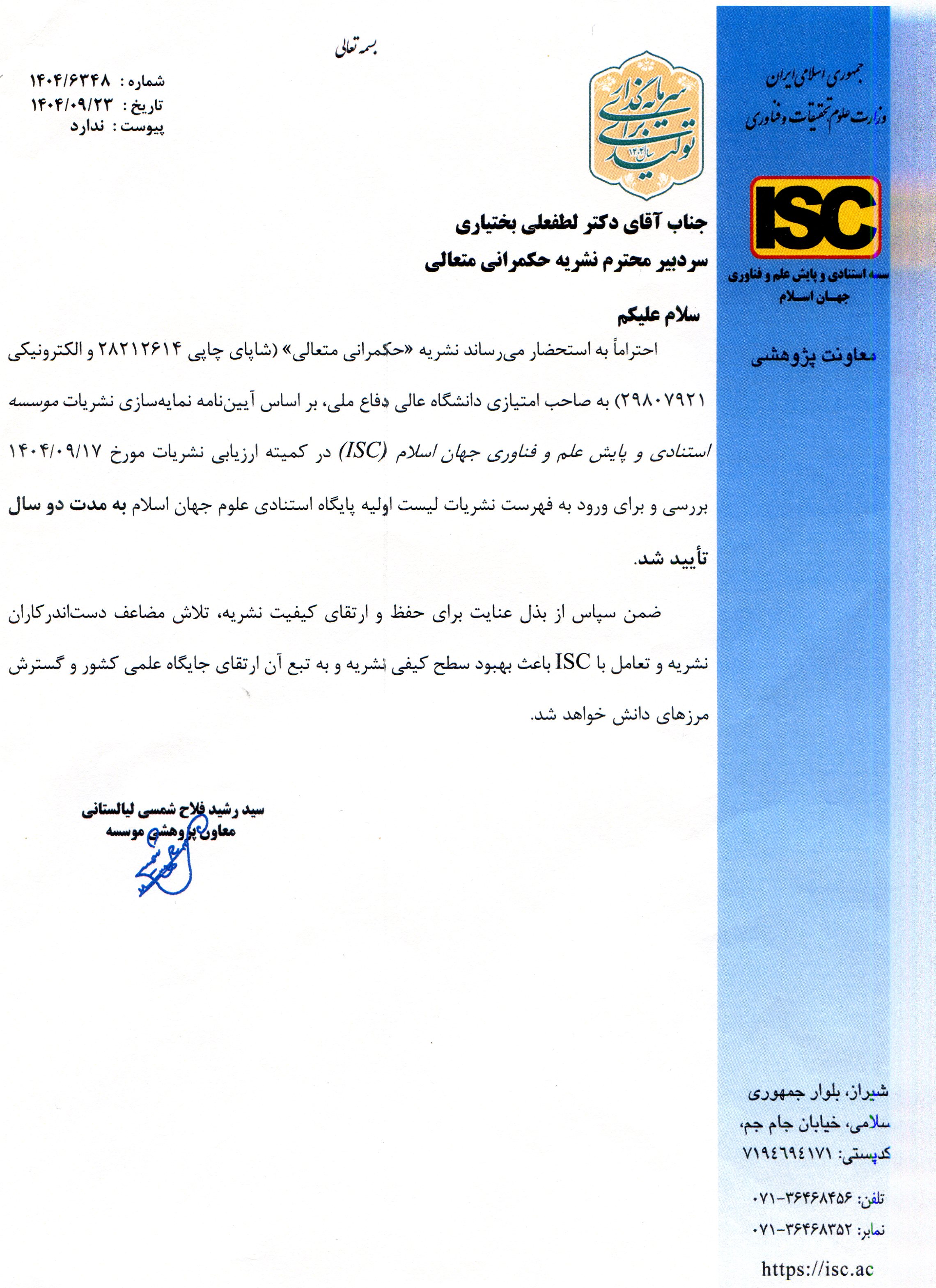 نمایه شدن فصلنامه علمی حکمرانی متعالی در پایگاه استنادی جهان اسلام (ISC)
